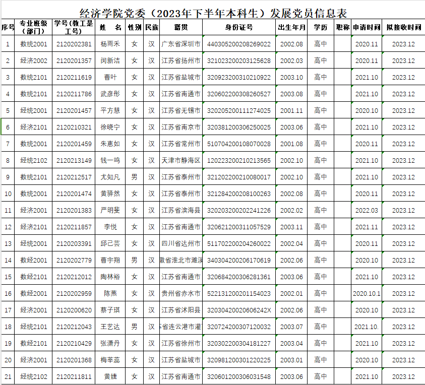 根据《发展党员工作实施细则》有关规定,经学院基层党支部考察、学院党委预审,拟接收杨雨禾等21名本科生人为中共预备党员。现予以公示: