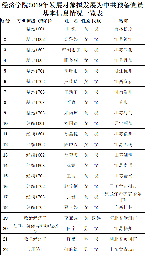根据《发展党员工作实施细则》有关规定,经学院基层党支部考察、学院党委预审,拟接收田璇等22名同志为中共预备党员。现将名单予以公示: