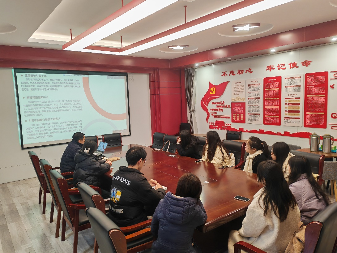 会议初始,韩中老师介绍了本次党课学习的背景和重要意义,强调了习近平总书记重要讲话精神对研究生党员的学习和研究工作的指导作用,以及对个人政治素养提升的重要性。会议过程中,韩中老师带领大家学习习近平总书记的重要讲话内容,分别从全会精神的核心要义、守正创新的改革原则、改革的系统工程方法、凝聚共识推进改革进行学习。