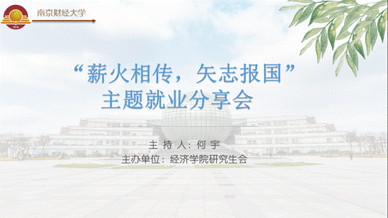 本次活动邀请到17级西方经济学的丁柏超、陈伟和18级应用统计的张振宇三位毕业班研究生,他们分别在求职、考博和就业方面取得了较为突出的成绩。活动过程中,丁柏超同学从职业方向选择、简历投递、笔试准备与面试发挥等方面讲述了自身的求职经历,并积极鼓励研究生同学们在一次次面试过程中积累发散性思维、培养严密的逻辑体系,也要提高语言表达能力,以期更好地回答面试官的问题。陈伟同学分享了考取上海财经大学博士生的经验,强调了研究生期间作出良好成果对于后期学校选择的重要性,他认为扎实的专业基础知识、高效的时间管理计划与良好的身体素质是使自身在竞争中脱颖而出的关键原因。张振宇同学分析了成人漫画