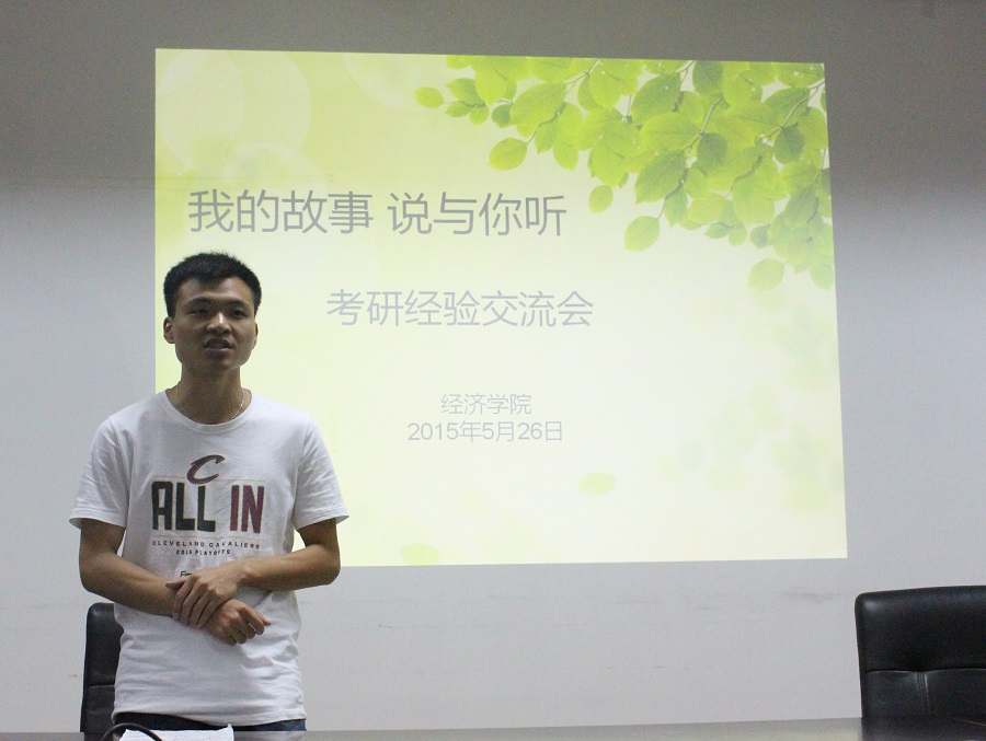 在 5月26日晚于经济学科楼307会议室举行了“我的故事,说与你听”青春故事分享会(考研专场)的活动,本次活动邀请了大四的三位学长学姐参加,分别为丁超超同学、徐韵琨同学和张绍依同学。