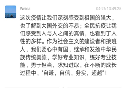 武伟娜老师说:在全民抗疫的这段时间里,我们感受到人与人之间的真情,感受到祖国的强大,制度的优越,作为社会主义的建设者和接班人,同学们要心中有国,学好专业知识,练好专业技能,勇于担当,求知进取,在不断的成长过程中,“自谦,自信,务实,超越”!