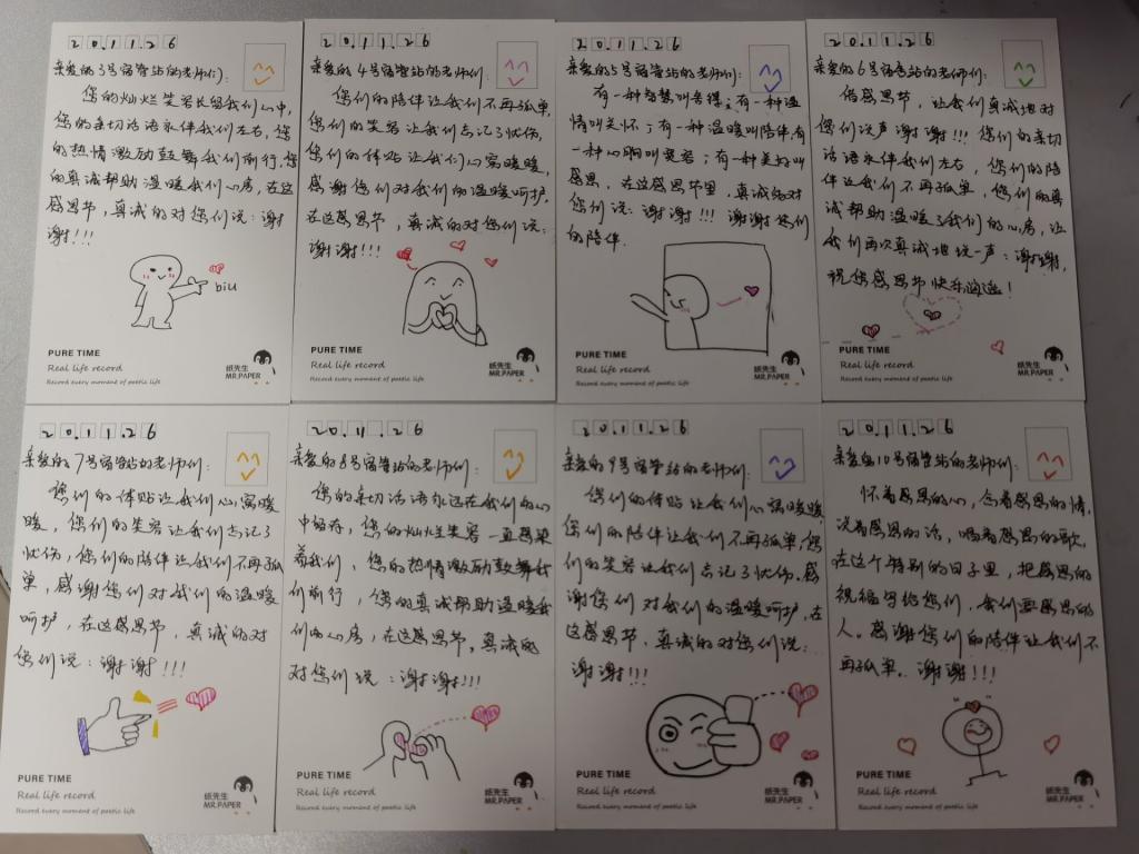 同学们将亲手书写的祝福卡片送给当天的授课老师和学院的辅导员老师,表达同学们对老师传授知识的感谢,让老师们切实感受到同学们的对老师辛勤付出诲人不倦的感激之情。同学们向宿管阿姨、保安叔叔和食堂工作人员赠送祝福贺卡,表达同学们对他们工作的认可以及感谢,感谢他们的兢兢业业,在自己的岗位上默默付出,甘于奉献。