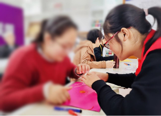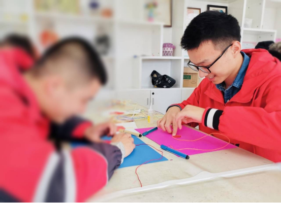 “乐趣纸绳画”的活动游戏中,志愿者们采取一对一教学,每组都分配到七彩纸绳和酒精胶水。小老师们拿出事先准备好的图案给学员们挑选,有的学员自信满满的主动拿起水彩笔和纸绳在卡纸上照图案认真的模仿贴画;有的学员因自身原因选择和志愿小老师们一齐完成贴画。