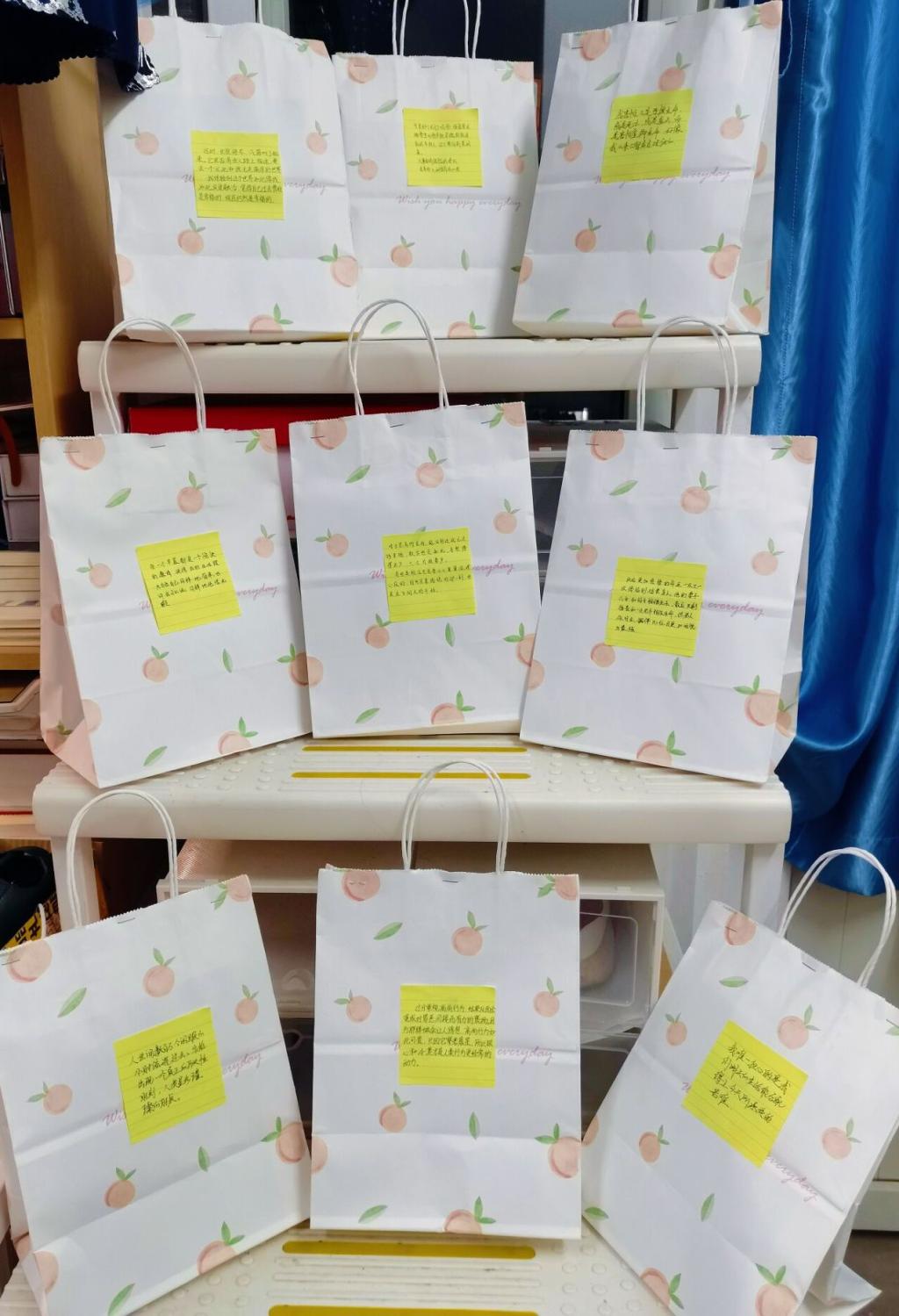 的同学们将手边的纸拎袋、纸质包装袋给心爱的书籍包上书衣,改造成特别的书皮,不仅保护了书籍,还可以把书拎着走,成为校园内一道亮丽的风景。