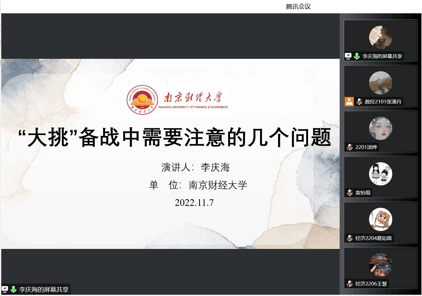 经验分享环节,纪齐同学和桑海瑞同学进行经验分享。纪齐同学曾获大挑国家级一等奖,大创省级立项,市调省级一等奖。他从选题出发,提醒大家最好结合国家重大发展战略,把选题这个重要的环节做好。同时,他强调了寻找队员、提高社会影响力以及实地调研等方面需要注意的事项。纪齐同学提醒大家想要在大挑中取得令人满意的成绩,需要长期的准备与合理的规划,把专业知识掌握好,在宏观上把握全局。