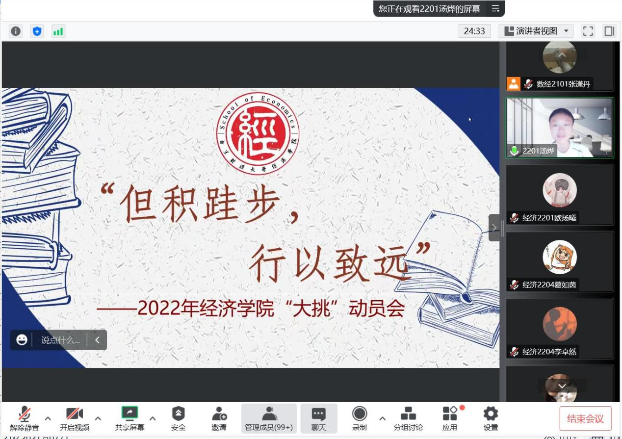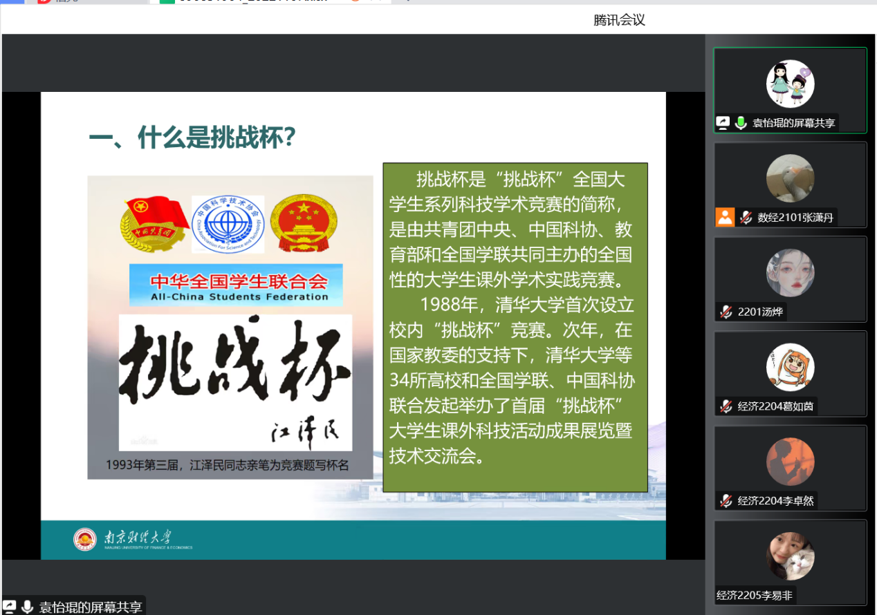 “挑战杯”全国大学生课外学术科技作品竞赛(简称“大挑”)动员及经验分享会。学院党委副书记袁怡琨老师,统计系副主任、副教授李庆海老师出席会议,数经2001班纪齐和桑海瑞同学作行经验分享,学院各年级同学参加此次动员会。