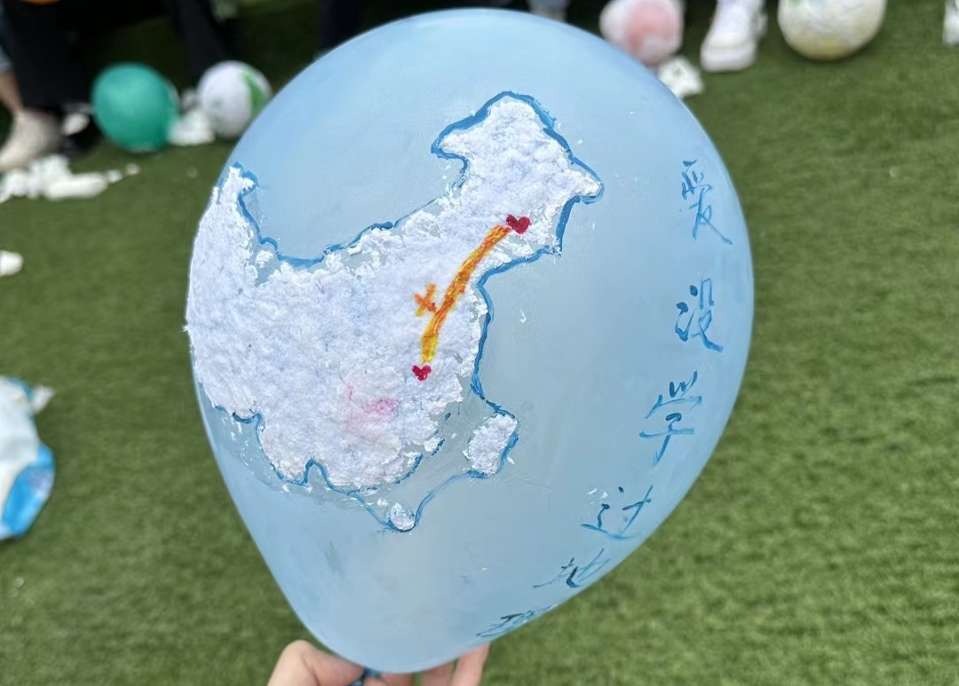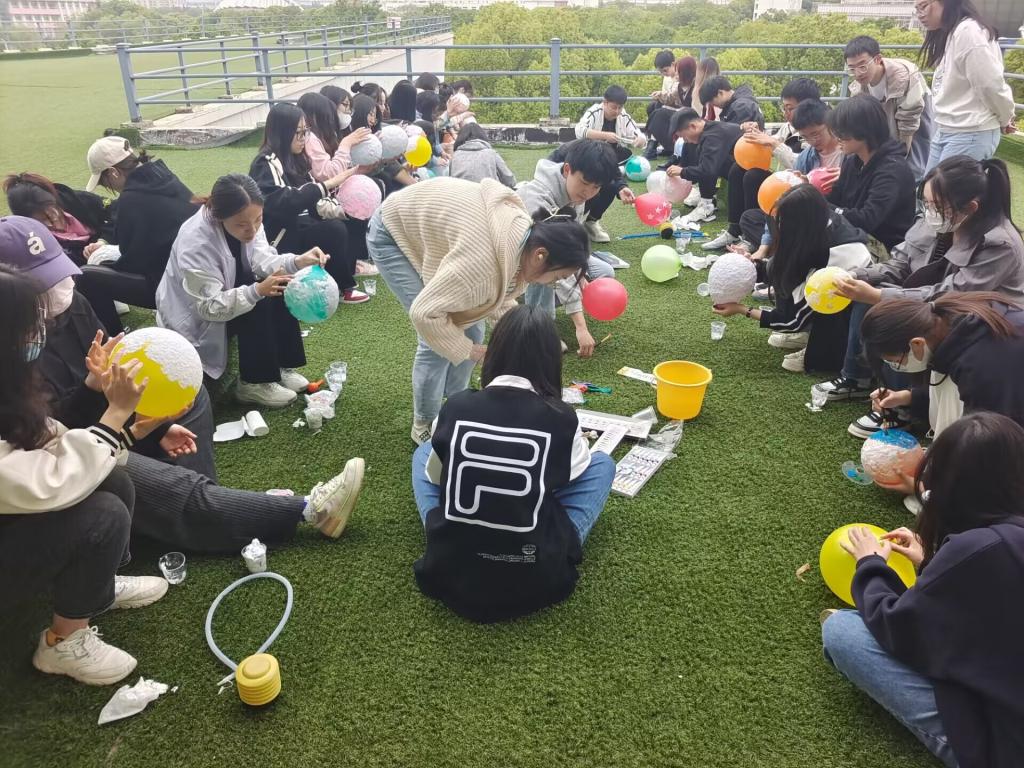 在轻松愉快的氛围中,志愿者们坐在草坪上,伴随着春日徐徐的微风,开始了纸浆气球的制作。用纸浆包裹气球的这个环节,耗时长、难度大,但同学们耐心十足,为气球穿上了细腻的“纸衣裳”。接着,同学们还纷纷拿起画笔,在气球上出对未来和自然的真挚期许和美好祝愿。有的以国旗为创作模板,在红色的气球上点缀上金黄色的五角星;有的以青山绿水为愿景,将山清水秀的画面呈现于气球之上……大家用各式各样的图案设计与鲜艳的色彩碰撞,展现出一幅幅美丽画卷。