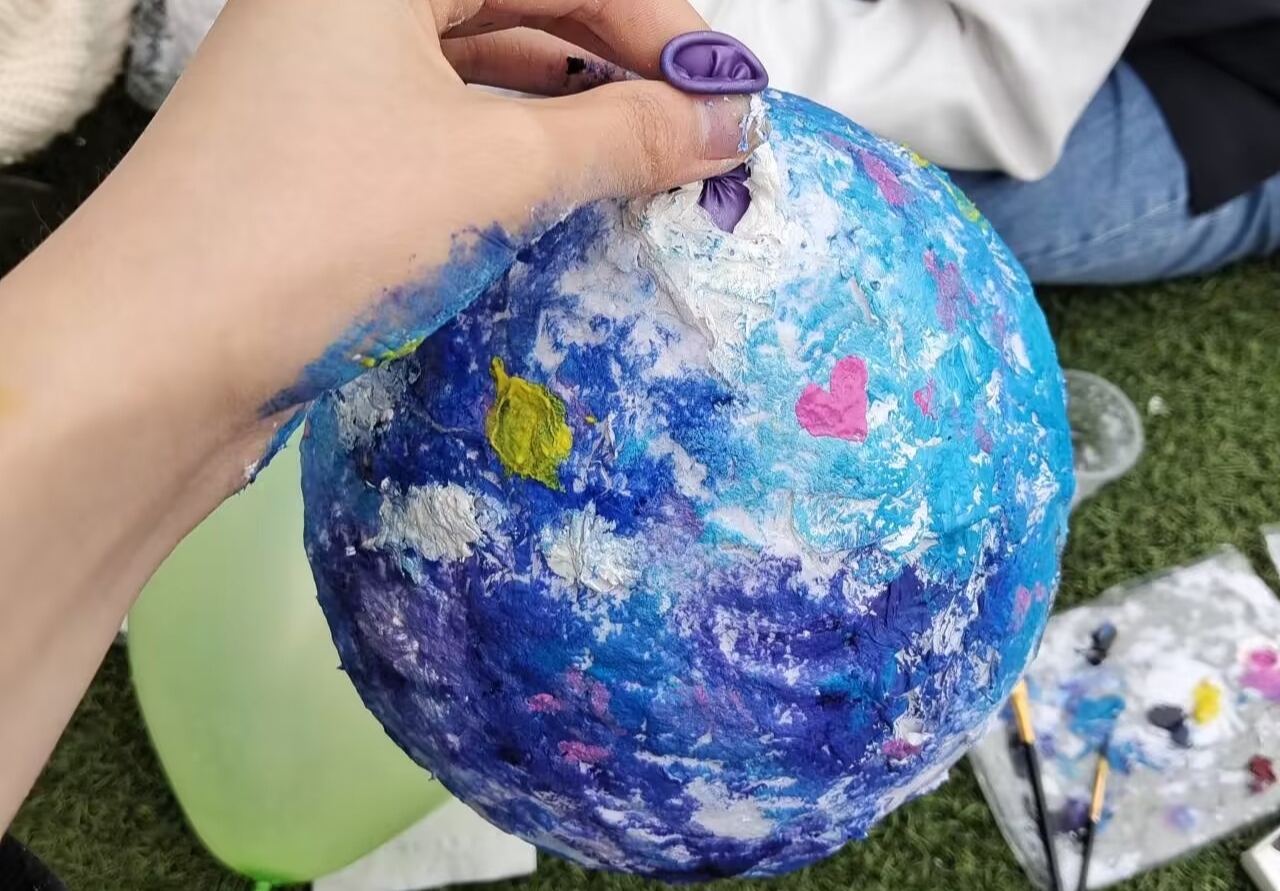 在活动现场,两位主持人介绍了世界地球日的来历及意义,让同学们对世界地球日有了进一步的了解,随后便开始了本次活动的主要内容——制作纸浆气球。同学们将纸用水沾湿,给气球穿上“纸衣服”,再用纸浆包裹于气球上,等待纸浆风干后,便可用画笔在气球上绘制图案。