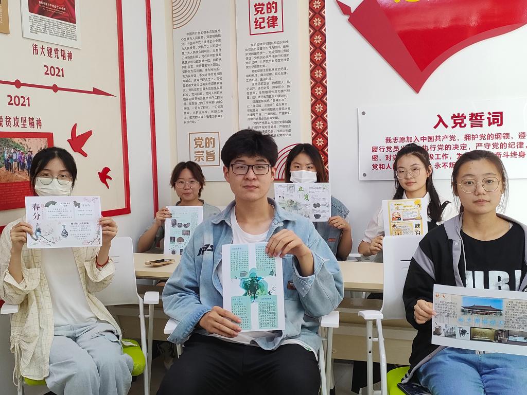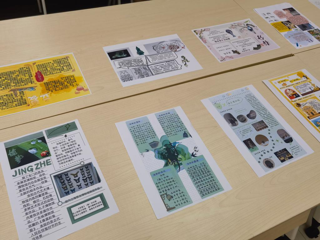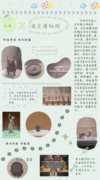 活动前期,同学们收集展现四季情思的“时节绘画”、承载古人浪漫的节气文物和体现农耕生产的艺术作品等,自主选择节气主题并制作手帐,如清明植树、处暑积肥、秋分种麦等,对馆藏文物节气元素进行提取运用,制作成精美的笺谱与手账。在展览现场,同学们相互交流创作理念,深入了解传统技艺及馆藏文物背后的文化底蕴,在学习贯彻习近平新时代中国特色社会主义思想主题教育中上了一堂生动的文化自信课。