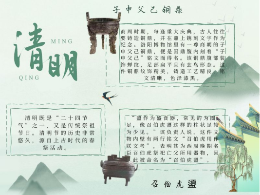 经统2101张玉璐同学选取了样式独特的子申父己铜鼎及召伯虎盨。通过介绍商周青铜器,追溯清明祭祖传统的由来。