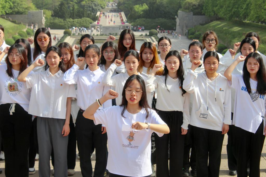 新民主主义革命时期,有一大批共产党人和爱国志士,为了民族解放、民主自由,英勇牺牲在雨花台。来到雨花台烈士陵园,学员们都被远处屹立的烈士群雕像震撼。他们雄伟的身躯、坚定的目光,无不展现了就义前英勇不屈的形象。按照路标一路来到烈士纪念碑前,透过高高的台阶,仰望巨大的石碑,先烈们的事迹浮现在脑海之中。碑前竖立的青铜雕像,“挣开镣铐”的主题象征着中国共产党人、爱国志士宁死不屈的革命精神,前进的号角仿佛穿过了岁月的洗礼,回荡在大家耳边,令人热血翻涌。紧接着,学员们在纪念碑前整齐列队,对着团旗振臂宣誓,大声庄重说出自己的誓言。