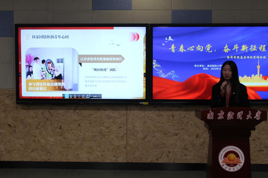 在第一场宣讲会现场,院团委书记潘怡老师以“把论文写在祖国大地上,将青春融入乡村振兴中”为主题,以党的二十大报告中关于全方位夯实粮食安全根基的要求为引,聚焦我校粮食特色,从在儿时埋下梦想的“种子”、把论文写在祖国大地上、以家国情怀润青年心田三个方面,用第26届中国青年五四奖章获得者、水稻专家周雷的成长故事,激励广大青年们在这所以财经为底色、粮食为特色的大学里努力学习、积极实践,用双脚丈量祖国,用所长服务社会,以青春姿态将论文写在祖国的大地上。