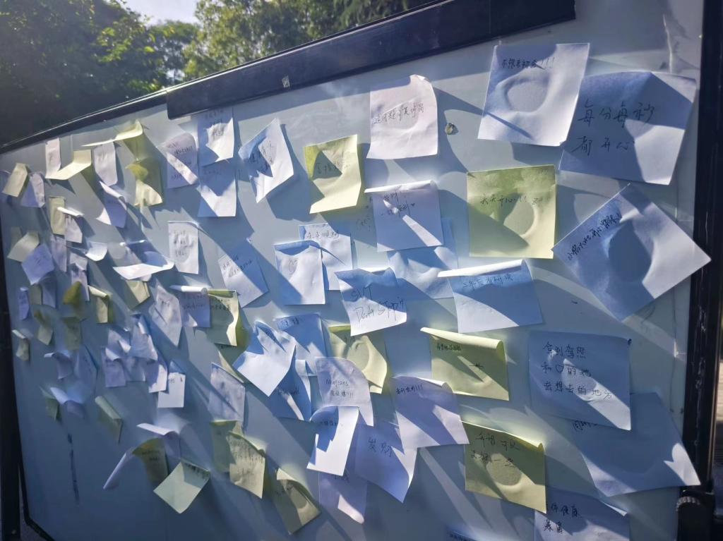 春夏交接日的午后,头顶洒下的阳光,熠熠生辉,温暖且明亮。同学们在西苑食堂门口开始集章活动。活动点的第一个任务是在便利贴上写下对未来的期许并贴在匿名表白墙上。在活动最后,表白墙上已经贴满同学们的憧憬与愿望。5月20日是个浪漫的日子,同学们也不忘为党献上专属告白。为此而设置的第二个任务点——党团知识竞答便引导同学们回顾了中国共产党带领中华民族站起来、富起来、强起来的伟大实践,回顾了中国共产党百年奋斗的光辉历程。