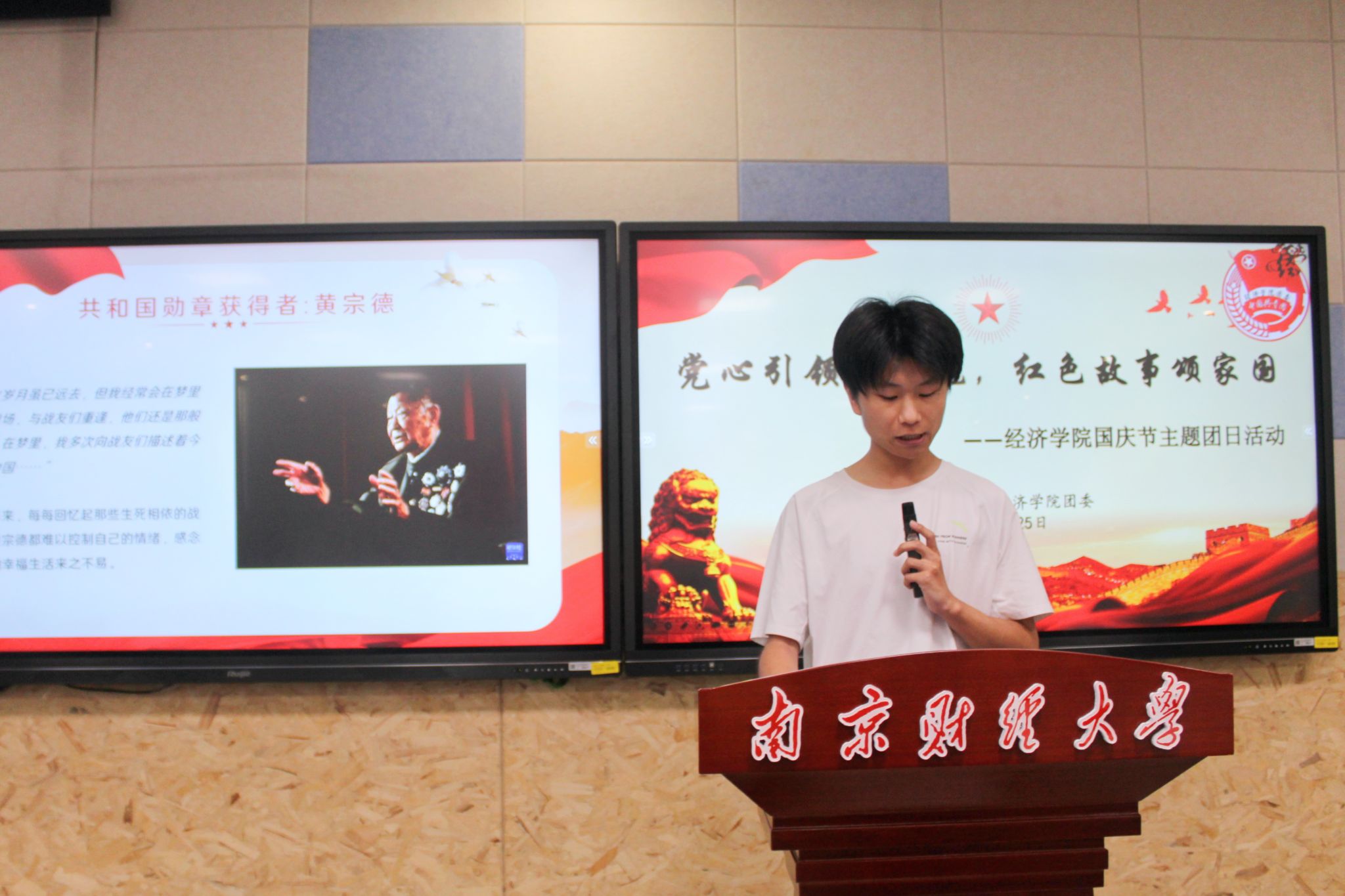 活动伊始,中共预备党员唐昊同学为大家深情讲述共和国勋章获得者黄宗德的故事。“重伤不叫苦,轻伤不下火线。”黄宗德在渡江战役、抗美援朝等多场战役中冲锋陷阵、屡立战功。离休以后,他依旧坚守初心,不懈工作。在他的影响下,三名子女都曾参军入伍,光荣地投身于保家卫国的行列。黄宗德用自己波澜壮阔的生命历程,书写了一段段关于勇气、忠诚与奉献的不朽篇章。