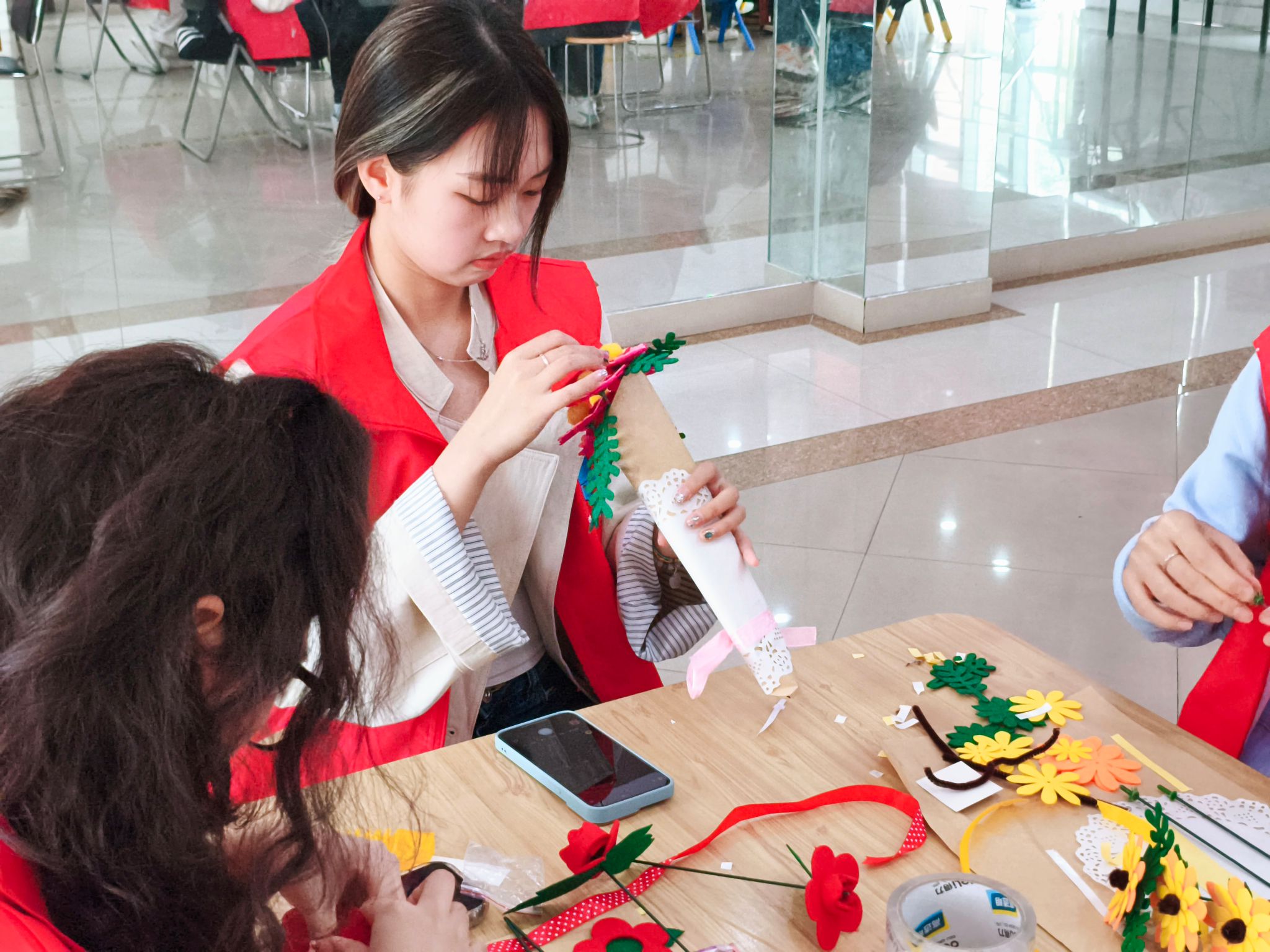 活动现场,参与者们热情高涨,全情投入,各展所能。在花束制作区域,同学们专注地裁剪不织布,经过折叠、粘贴等工序,制作出栩栩如生的布花束。还有人挑选珠子搭配彩绳,编织小雏菊手绳,或用扭扭棒弯折出童趣的花朵。这些手工作品不仅展现了手工艺术魅力,更彰显出女性在生活细节中的智慧与力量。