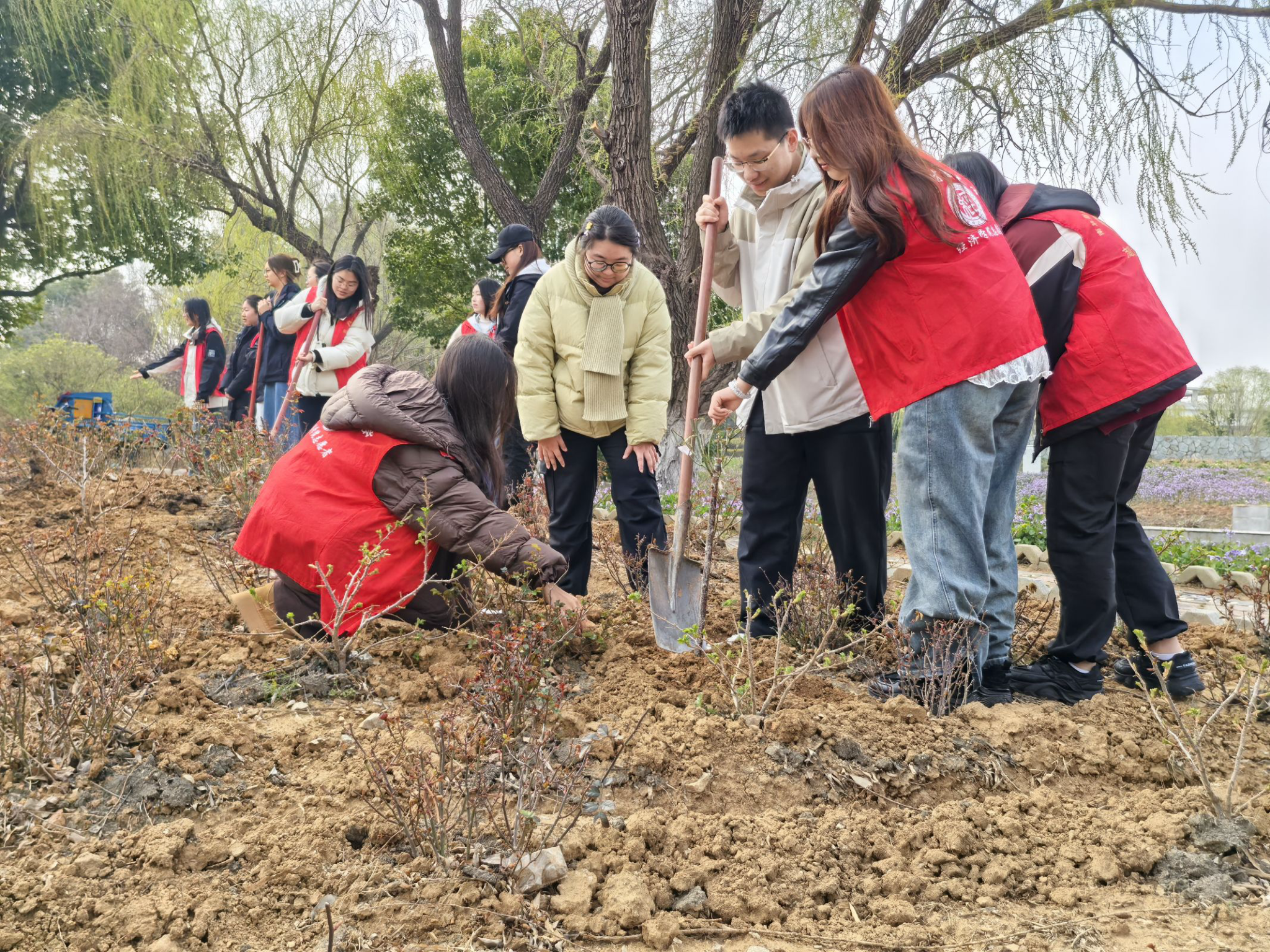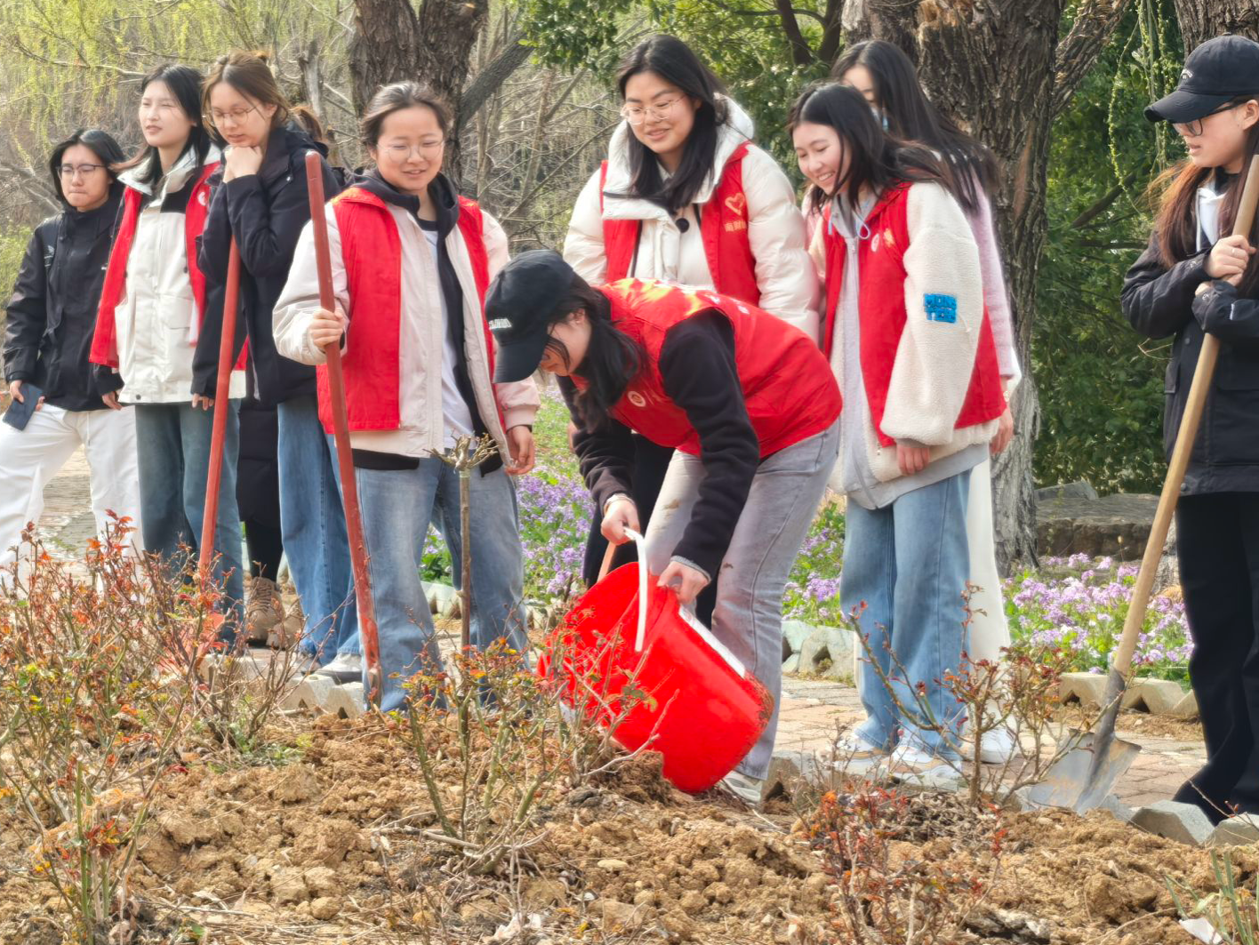 组织志愿者在博远楼南侧月季园开展“植此青绿 不负春光”植树节主题活动,旨在以植树节为契机,弘扬绿色发展理念,增强学生环保意识,为校园生态建设注入青春力量。