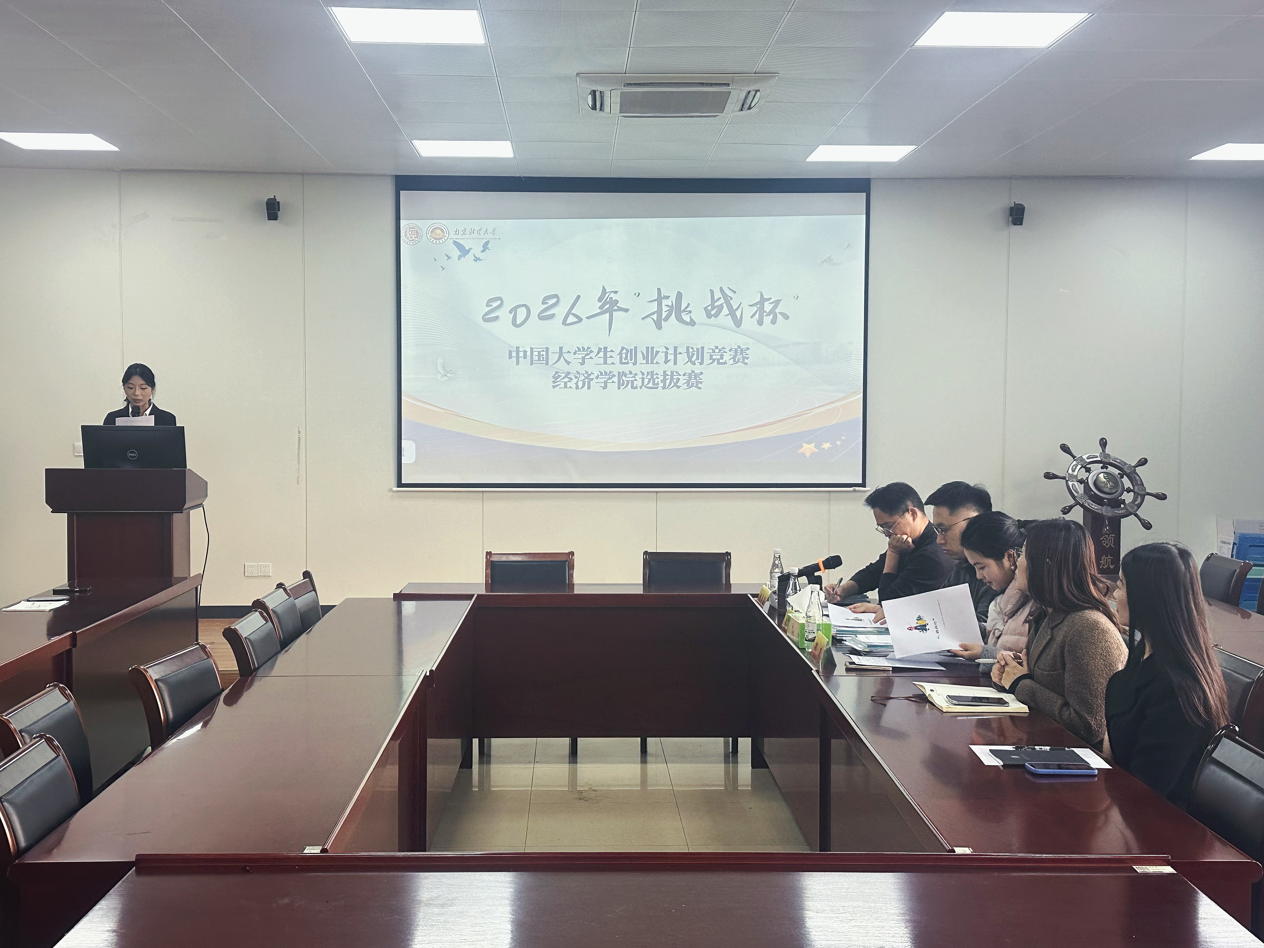 李庆海、陈杰、邵玮三位老师担任评委,学院党委副书记贾亦璞、团委相关人员、“小挑”项目指导老师以及学生团队到场观摩。