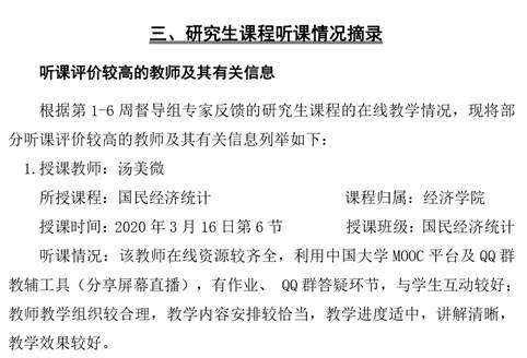 担任研究生课程《国民经济统计》的汤美微老师被点名表扬,学校督导组认为:“该教师在线资源较齐全,利用中国大学MOOC平台及QQ群教辅工具(分享屏幕直播),有作业、QQ群答疑环节,与学生互动较好;教师教学组织较合理,教学内容安排较恰当,教学进度适中,讲解清晰,教学效果较好。”
