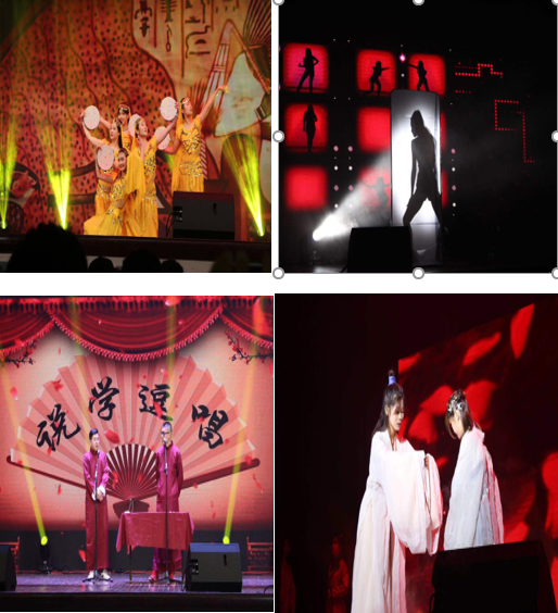 舞蹈《书简舞》营造了古色古香的意境;原创歌曲《安西》让观众沉浸在美妙的歌声中;相声《胡说八道》两位演员用幽默的语言、夸张的动作让在场的观众笑声阵阵;舞蹈《海市蜃音》展现了异域风情;歌曲《南屏晚钟》让观众如痴如醉;默剧《人生》的演员们通过超群的想象力、卡通般的肢体表达,出人意料的剧情反转,温馨的结局赢得了观众们阵阵掌声;武术《精武风云》响亮的口号和整齐划一、行云流水的动作让观众连连叫好;舞蹈串烧的舞者们在银色灯光下活力四射;歌曲《世间美好与你环环相扣》和汉服走秀《国色天香》给观众们带来了一场视听和视觉盛宴。晚会在《我和我的祖国》的歌声中圆满结束。
