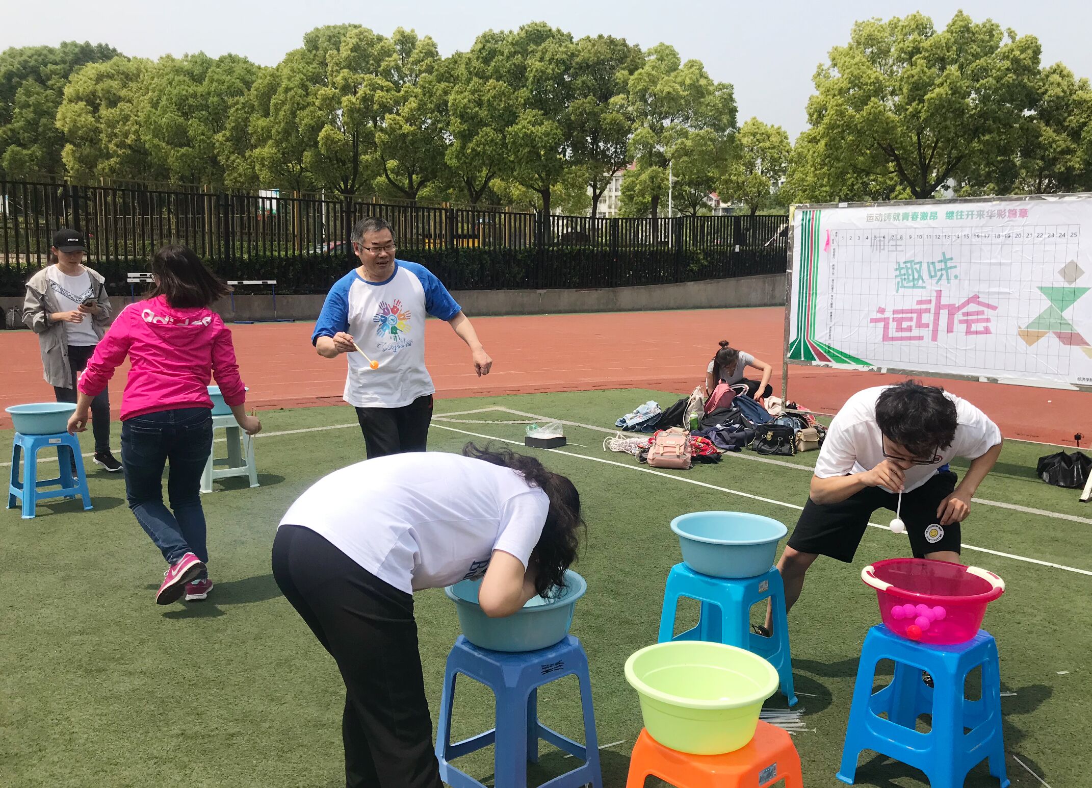 院服接力传送气球,比赛激烈角逐,精彩纷呈。“神舟入星海”是一人抛球一人用篓子接球。有的队伍中,老师瞄准篓子,博力一抛,学生找准球的落地方向,竭力接住,配合默契;有的队伍迅速抛球、接球,接连不断。比赛场上,一名运动员指挥着另一名蒙着眼的运动员敏捷地跨过障碍物,共同参与“港澳回归”趣味比赛,“左移、停。现在保持平衡,大步迈前。”激动的指挥声显示出运动员的认真和细心。移动的指压板上,师生接力奋勇奔跑,拼搏前行,竞技“奔驰的高铁”项目,彰显运动风采。
