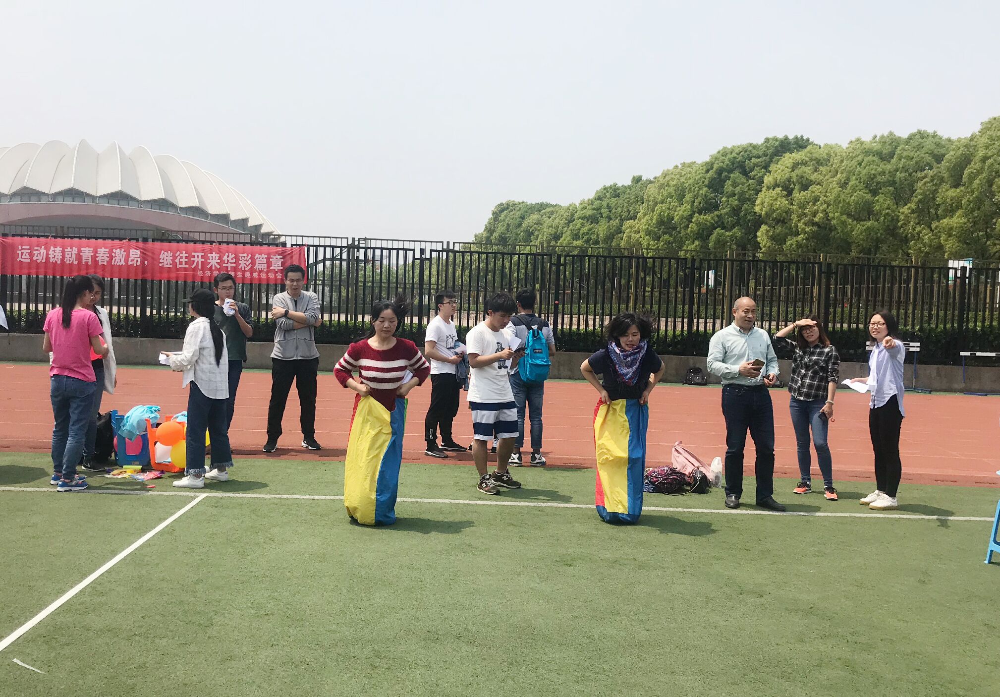 “砥砺前行”比赛中,师生组抓稳节奏,从容不迫,在一分钟内一人用筷子将第一个碗里的乒乓球夹到第二个碗里,另一人用吸管将第二个碗里的乒乓球吸到第三个碗。“跨越入世”比赛中,师生穿上麻袋双腿并拢,奋力向前跳跃,交替完成来回的袋鼠跳。“南方的春天”中,教师和学生穿上成人漫画