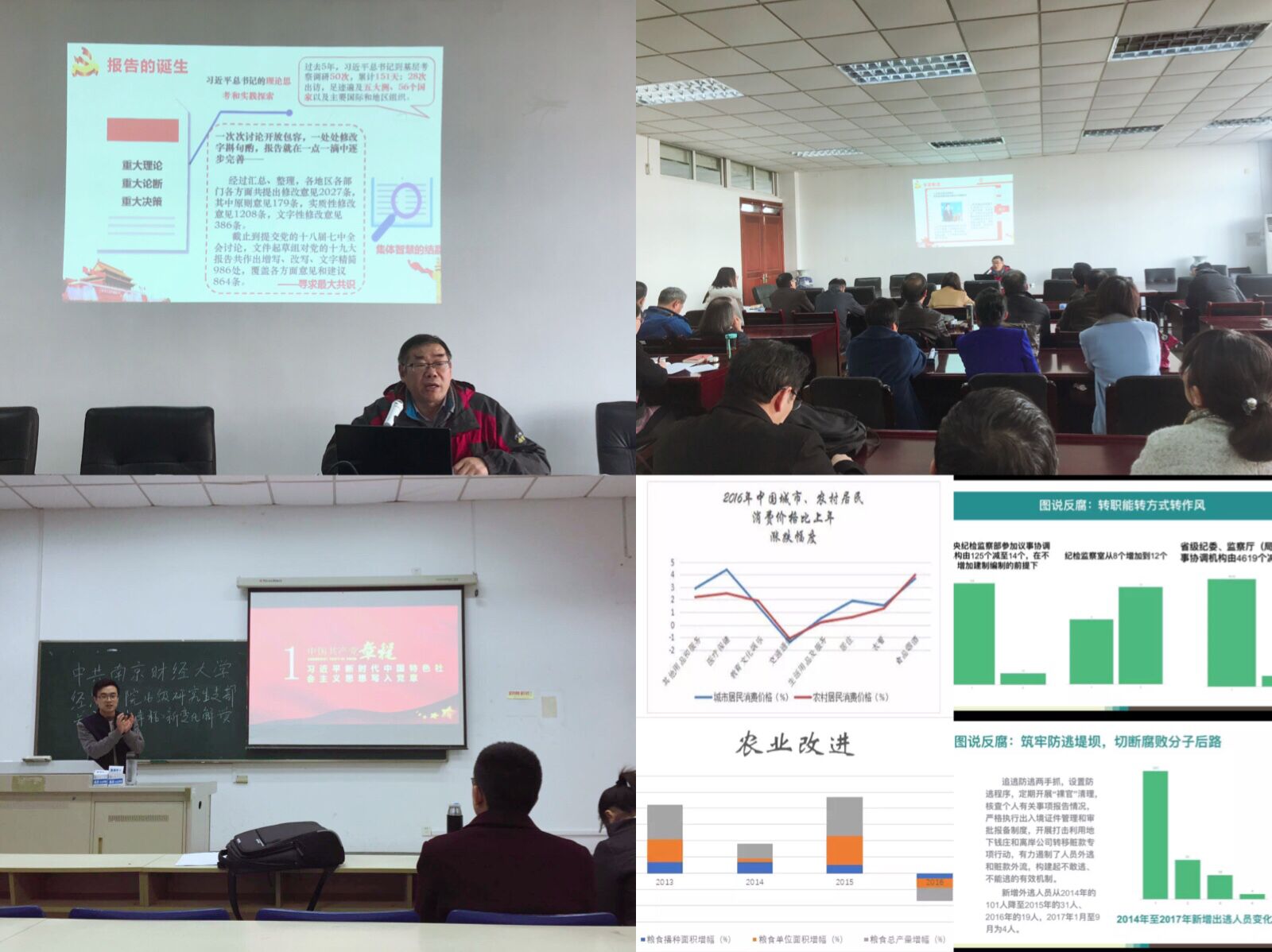 在德经楼307会议室组织全体教工共同学习党的十九大报告,党委书记陈耀辉以“聚焦党的十九大,深刻理解和把握十九大报告的精髓和要义”为主题,分析总结了十九大报告在政治、思想、理论、实践、世界历史五个方面的意义和地位。他围绕十九大报告的主线,将报告分为七大板块进行逻辑结构解读,并指出十九大报告的重点最终是聚焦到“定位、定标、定向、定法”上来。与会教师表示,通过此次学习,进一步明晰十九大报告的主题和意义,同时进一步明确十九大提出的新时代新思想指引下的工作部署和任务要求。