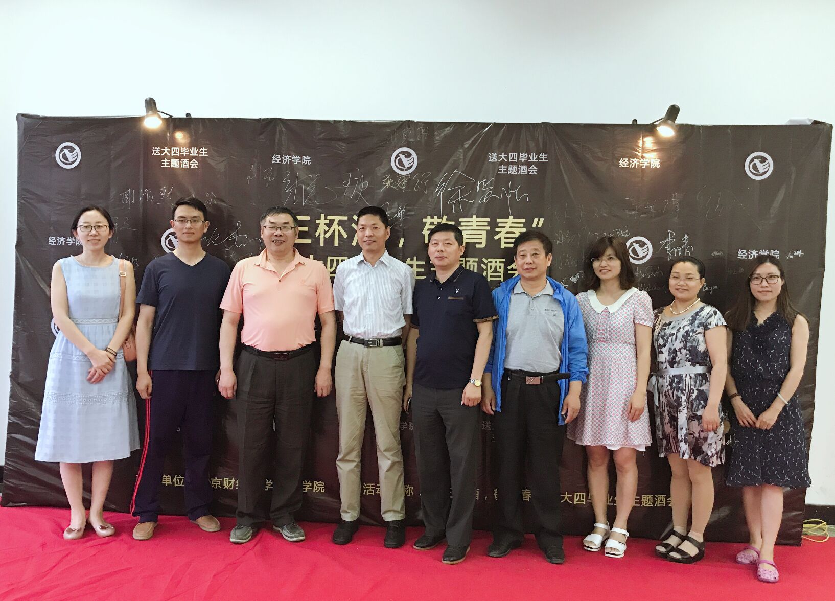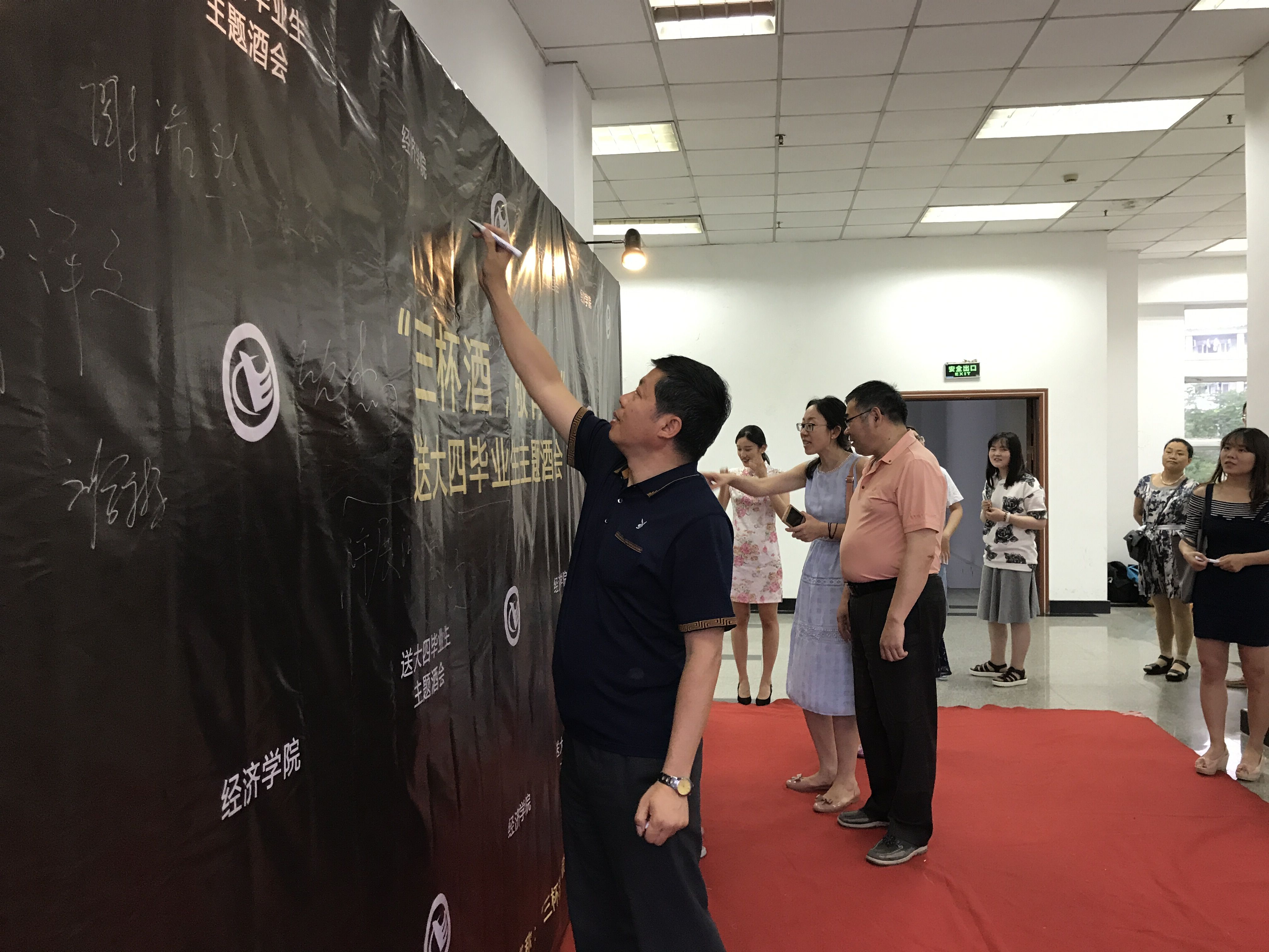 晚会开始前,大四毕业生陆续入场,并在签名墙上留下自己的姓名,与老师们合影留念。