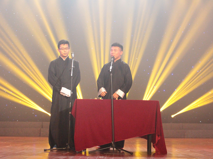 特聘外教老师Jeffery Smith自弹自唱起自创的歌曲《Doctor Night Shades》,洪亮独特的嗓音丝毫不逊专业歌手,博得现场观众连连鼓掌叫好。古典舞《梨花瘦》由大四毕业生费越同学自编自排自演,舞蹈柔中带刚,仙气十足,令人沉醉。歌曲《默》也是由大四毕业生倾情演唱,唱出了大学四年对青春的执着。王庚老师一首《我的中国心》将晚会推向高潮,王老师与同学们一起高歌祖国,还寄语毕业生们要有一颗永远情系母校的赤子心。随后播放了精心拍摄的视频,即将毕业的大四同学们出现在视频中,公开说出了想说的话,共同回忆了有趣的故事。毕业班辅导员尹海燕与副院长陈耀辉(主持工作)也出现在视频中,给毕业生送上了最诚挚的祝福。台下,有人开始小声的啜泣,郝园园老师携着尹海燕老师五岁的女儿出现在舞台中央,合唱一首《手牵手》,稚嫩清澈的嗓音将全场气氛再次推向高潮,“我们将要面对未来的分离,请你牢记这段记忆,朋友我永远祝福你,人生一定有起落,但请不要伤心,我会在你身边,把我们的心放在一起,共同度过风和雨”……最后,晚会在合唱《仰望天空》中缓缓落下帷幕。