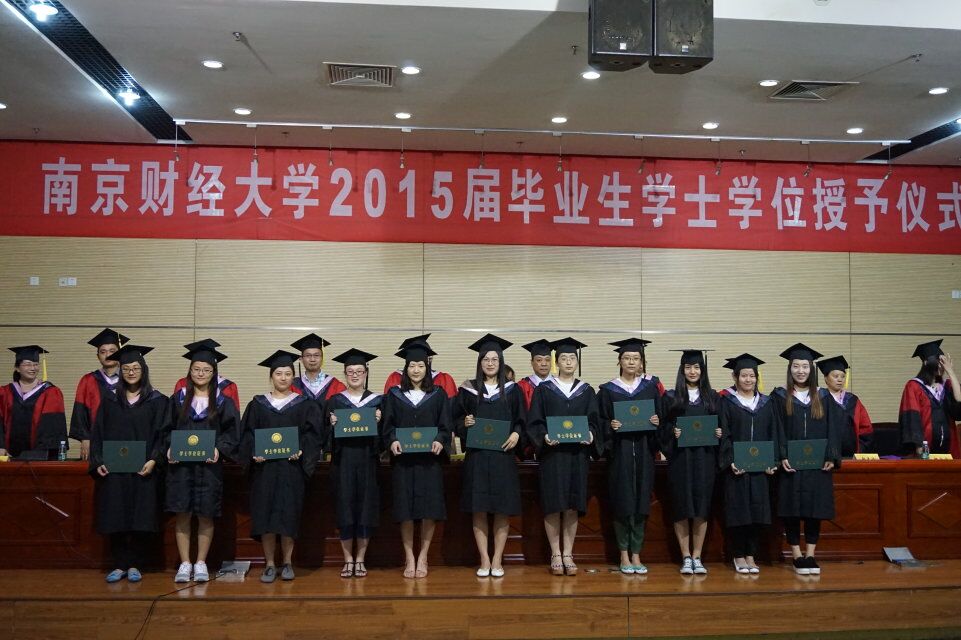 副院长叶林祥宣读了《关于同意授予2015届本科毕业生徐宁等3516位同学学士学位的决定》后,毕业生依次上台,与会领导和老师为毕业生颁发了学士学位证书、拨正流苏,并与同学们热情握手,表达祝愿。台下师生用他们热烈的掌声表达了对毕业生的祝贺与祝福。伴随着青春激昂的《南财大之歌》,学士学位授予仪式结束。