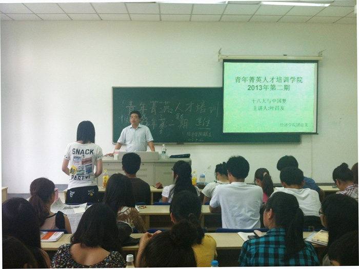 在专一104举办了青年菁英人才培训学院2013年第二期。此次培训邀请到了马克思主义学院党总支书记、院长叶昌友教授作为嘉宾,演讲主题为“十八大与中国梦”,成人漫画
