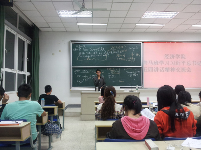 青年菁英人才培训学院学习习近平总书记五四讲话精神交流会在专一103举办。此次活动采取小组讨论的形式,各小组的同学在小组内讨论自己对五四精神的见解和感悟。最后,有六名同学代表各组上台发表关于五四精神的感悟。上台参与交流同学有曾小强同学,张美玲同学,尹娜同学,承维同学,陈栋同学,袁飙同学。