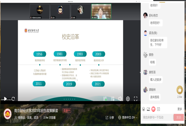 广大江西籍师生通过QQ群、微信群、视频号等社交媒体向家乡广泛宣传网络直播咨询会。咨询会当天,4.3万人在线咨询我校报考政策和相关情况,工作组老师的精准解答和热心解惑,获得了家长和学生们的一致好评,点赞量达3.1万人。