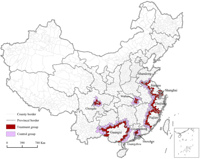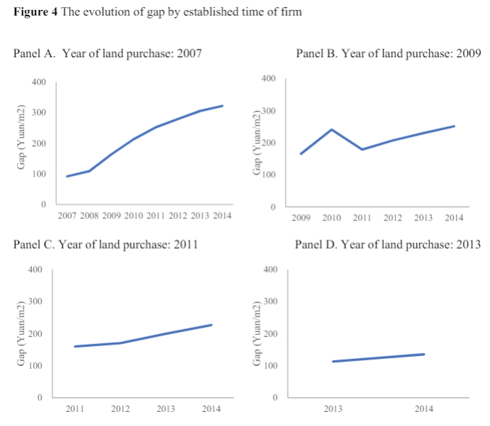 研究内容:该文首先从理论角度推导出投资强度管制如何导致了土地边际生产率与边际成本的偏离(Land gap),即土地错配,然后基于C-D生产函数计算了制造业部门土地错配程度,采用border discontinuity design研究方法实证检验了最低投资强度标准及其行业、区域异质性对土地错配的影响。在实证分析中,该文创新性地通过合并全国土地出让数据库及中国工业企业数据库筛构造了2007-2014全国新设立工业企业数据库(newly established manufacturing firms,20205家),该数据库包含了包括全部土地投入在内的企业要素使用及产出情况,极大地便利了从微观视角深入分析围绕企业土地利用的一系列经济行为。另外,该文还实证分析中考虑了产品市场的不完全性(imperfect competition in output markets)、地方政府在土地市场的角色(market power in land market, and corruption concern,内生性(reverse causality)及地区性及宏观经济冲击等问题(local trends and macroeconomic shocks)。
