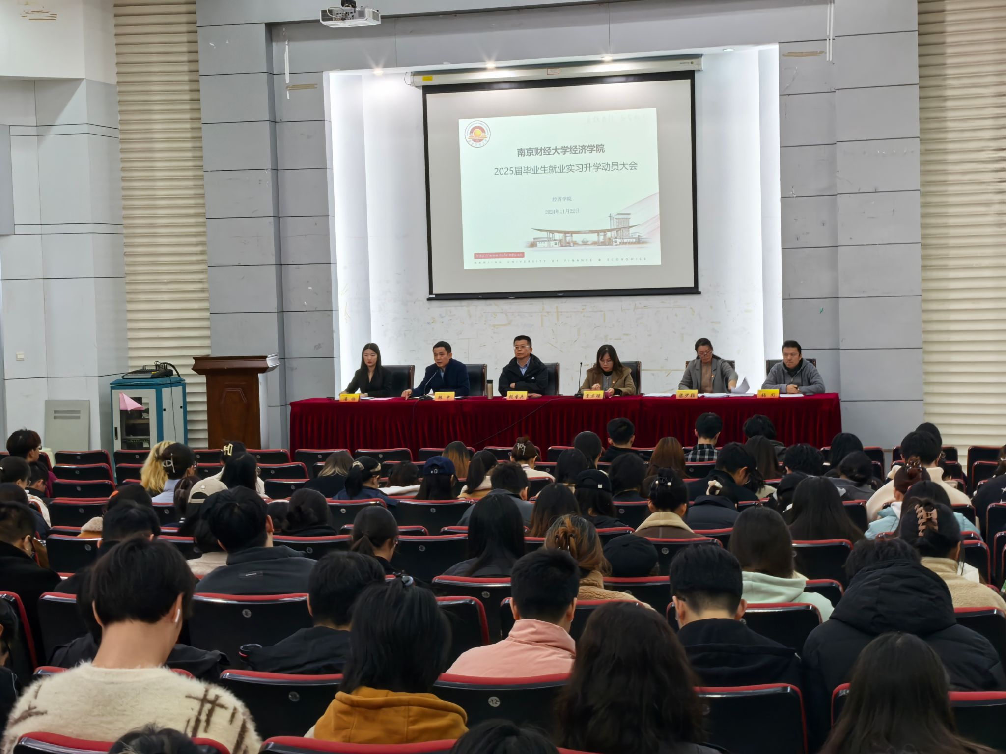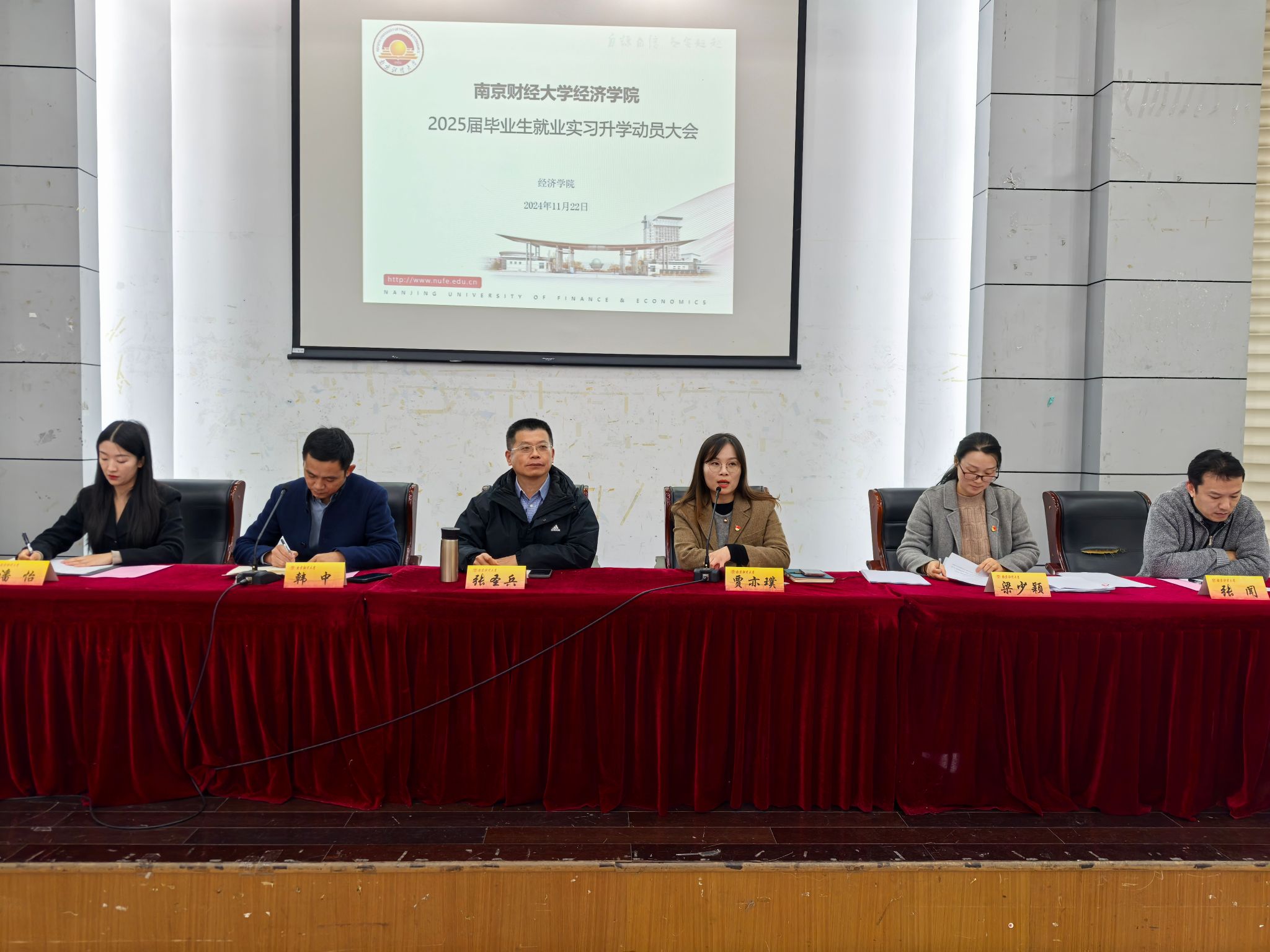 召开了2025届毕业生就业实习升学动员大会。学院党委书记张圣兵、党委副书记贾亦璞、副院长韩中、辅导员梁少颖、潘怡、张闻以及全体2025届毕业生参加了此次会议,会议由党委副书记贾亦璞主持。