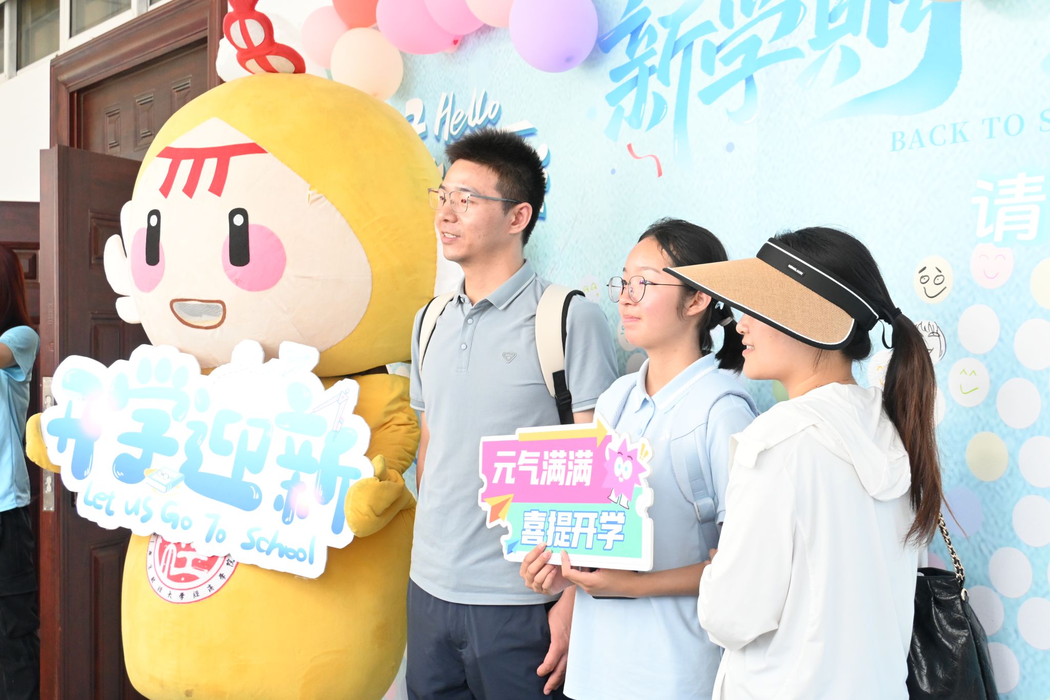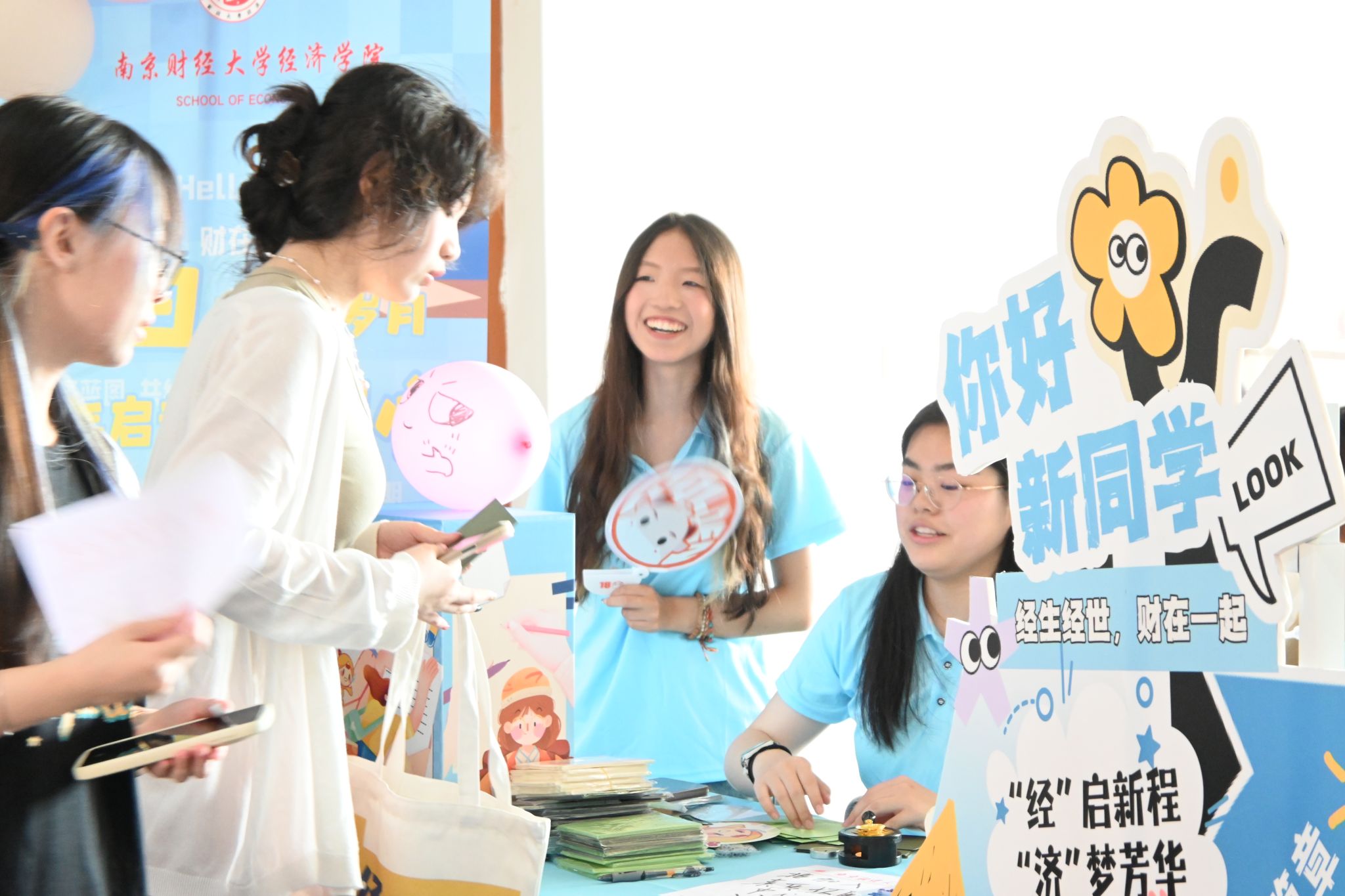 帆布袋,绘出“经”彩生活;“经济”便利贴,希望新生多多记录生活中的小确幸;“小经灵”钥匙扣以及定制徽章,展现学院的活泼姿态;独家南财明信片,体现校园靓丽风景;经院扇子,在炎热之际带来一丝清凉。这些温馨礼物拉近了学院与学生们的联系,进一步培养新生的爱校情怀。此外,学院还设置了可供打卡的笑脸墙。“新学期,新起点”,每一位新生都可以用马克笔绘制出自己心中的笑脸。342张灿烂的笑容共同组成“2025”的字样,表现出他们对大学生活的期待与喜悦,并且将始终以乐观的心态迎接大学四年磨炼与挑战。