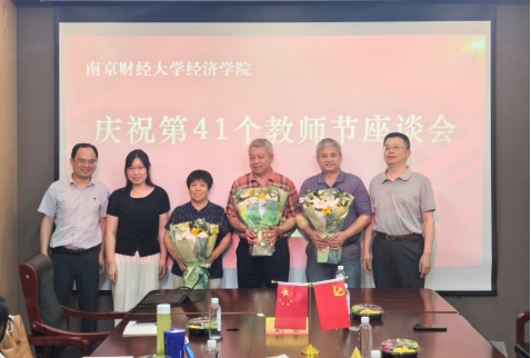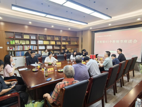 于德经楼323会议室隆重举行庆祝第41个教师节暨新教师座谈会。学院党委书记张圣兵、院长刘小峰、资深教师代表、近三年新入职教师、院校友会代表刘婷、各系系主任、分工会主席、辅导员代表共同参会。会议由院长助理刘余主持。