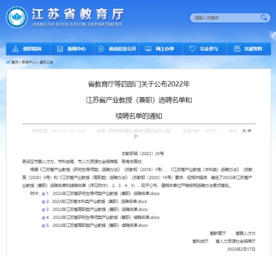 2022年新增1个江苏省产业教授