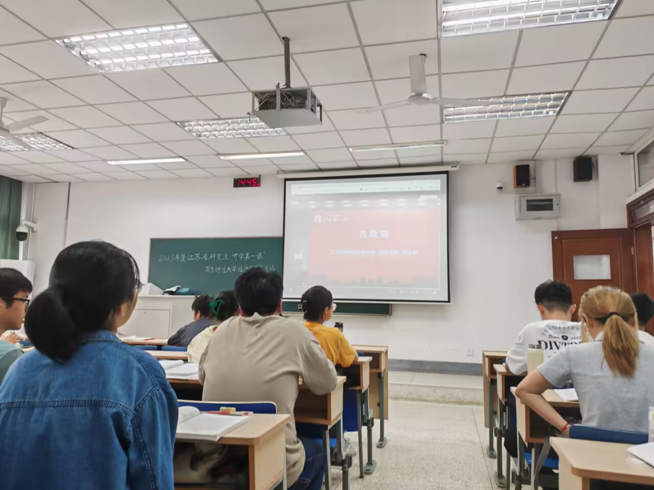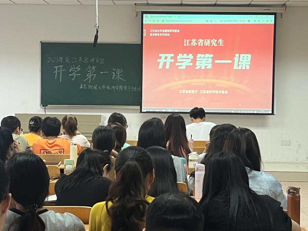 2023级研究生在德经楼210教室共同观看由省教育厅与省科协共同主办的江苏省研究生“开学第一课”,聆听专家院士对“青年担当”的诠释与指导。