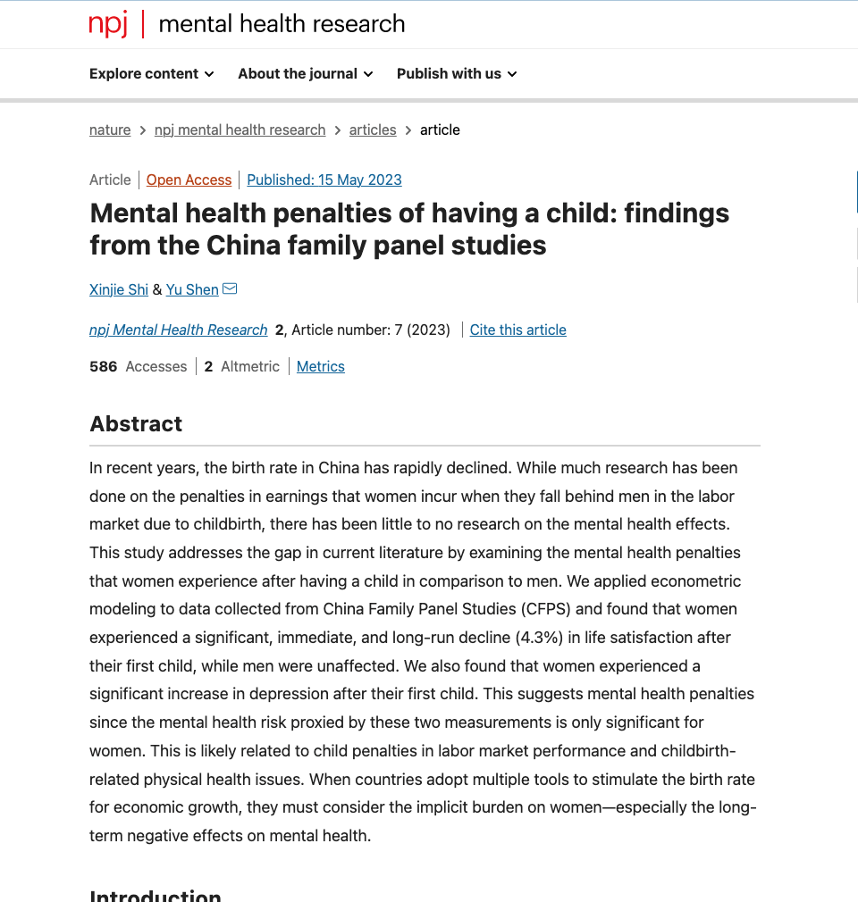 近日,成人漫画 成人漫画 沈煜作为通讯作者,与浙江大学中国农村发展研究院史新杰研究员合作的论文《Mental health penalties of having a child: findings from the China family panel studies》被Nature旗下子刊npj Mental Health Research录用并在线发表。