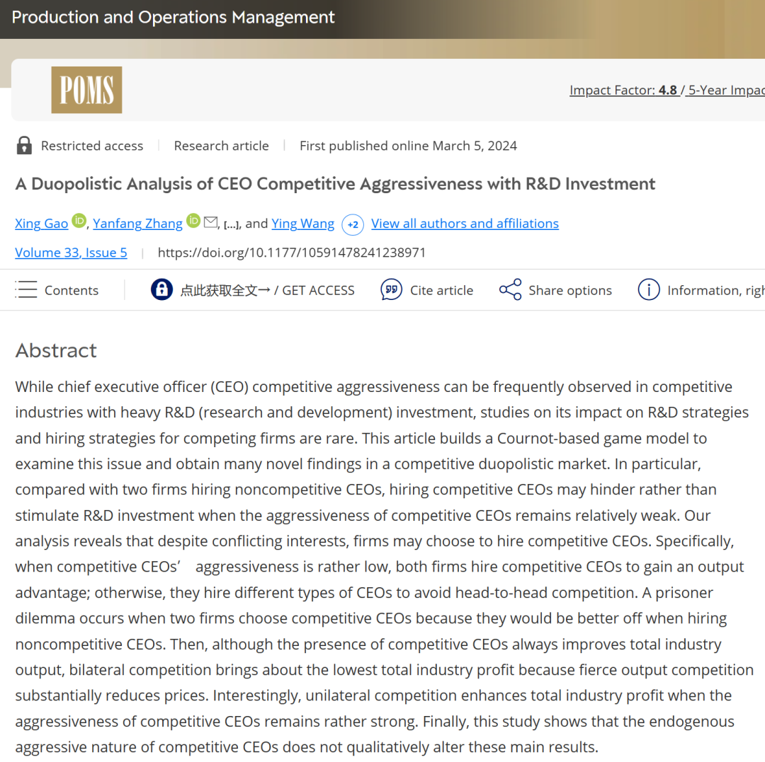 近日,成人漫画 成人漫画 张艳芳副教授作为通讯作者和共同第一作者,在管理学国际顶级期刊《Production and Operations Management》发表题为“A Duopolistic Analysis of CEO Competitive Aggressiveness with R&D Investment”的学术论文。据悉,《Production and Operations Management》(POM)是全球公认的UTD24国际顶级期刊之一。